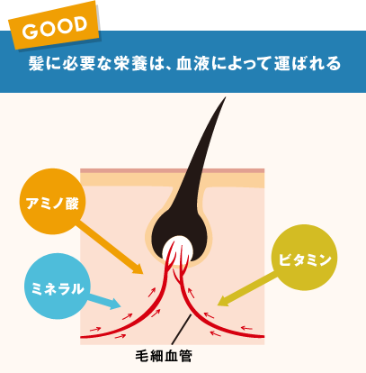 髪は頭皮の奥深くにある毛細血管から、栄養を得て髪をつくっています。冷えによって血行が悪くなると、髪に「アミノ酸」や「ビタミン」「ミネラル」などの栄養が十分に行き届かなくなり、抜け毛の原因になることもあります。