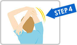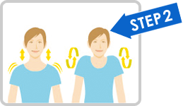 息を吸いながら両肩を耳の辺りまで持ちあげて3秒間キープし、息を吐きながら力を抜きます。同じ動きを3回繰り返してから肩を5回後ろに回します。