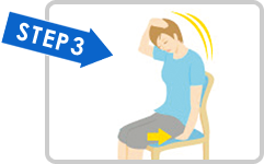 椅子に座り、左手を太ももの下にはさみ、右手で左側頭部をおさえます。気持ちいいと感じるところまでゆっくり首を曲げ3秒間キープします。これを左右1回ずつ。